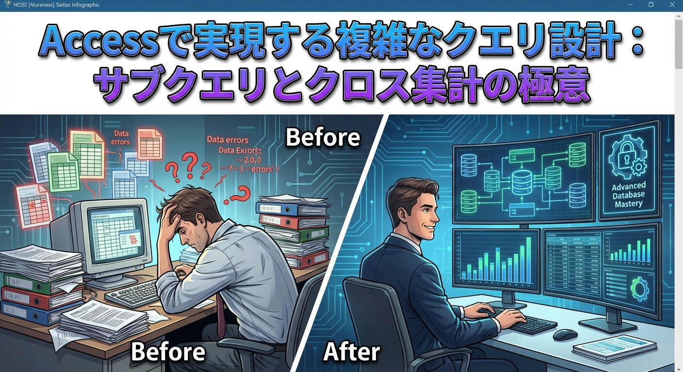 Accessを使ったデータベース管理の中で、クエリの設計は避けて通れない工程ですよね。中級者のあなたなら、基本的なクエリはお手の物かもしれませんが、複雑なクエリを作成しようとすると途端に壁にぶつかった経験、ありませんか?とくに、サブクエリやクロス集計を使った設計は一筋縄ではいかないものです。
