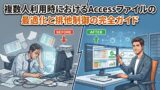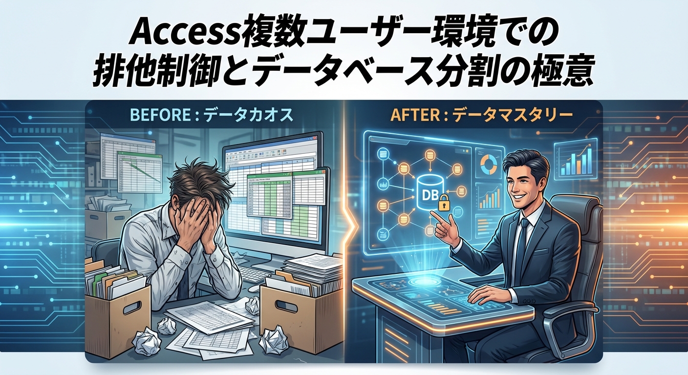 皆さん、Accessを複数のユーザーで同時に使おうとして、思わぬエラーやデータの競合に悩まされたことはないでしょうか?そんなとき、ついやってしまう失敗として、排他制御を誤解した設定や、データベースを分割していないことが挙げられます。例えば、ある日、同僚がデータを更新している最中に他の人が新しいデータを追加しようとしてエラーが発生した、なんてことがありました。