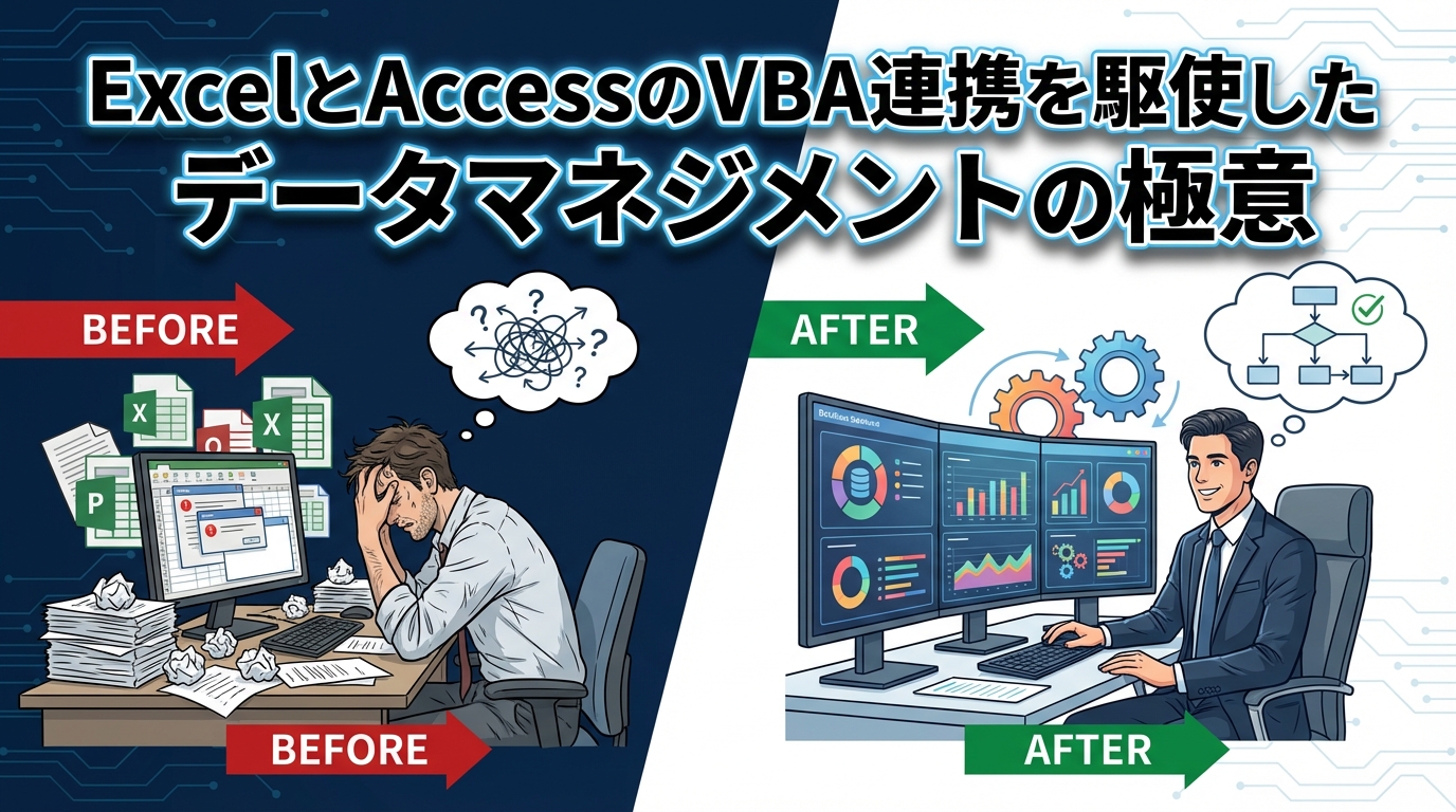 さて、今日のテーマはExcelとAccessの連携です。正直、Excelの自由度は素晴らしいですが、データ量が増えると処理が遅くなりがちですよね。そこでAccessを使って効率的にデータを管理する方法を知りたいという声をよく聞きます。しかし、VBAでその連携を構築する際、意図しないデータの上書きや、デバッグが難しいエラーにぶつかることもしばしば。私も昔、複数のExcelファイルからデータを集計してAccessに集約しようとしたとき、無限ループに陥って一晩中頭を抱えた経験があります。